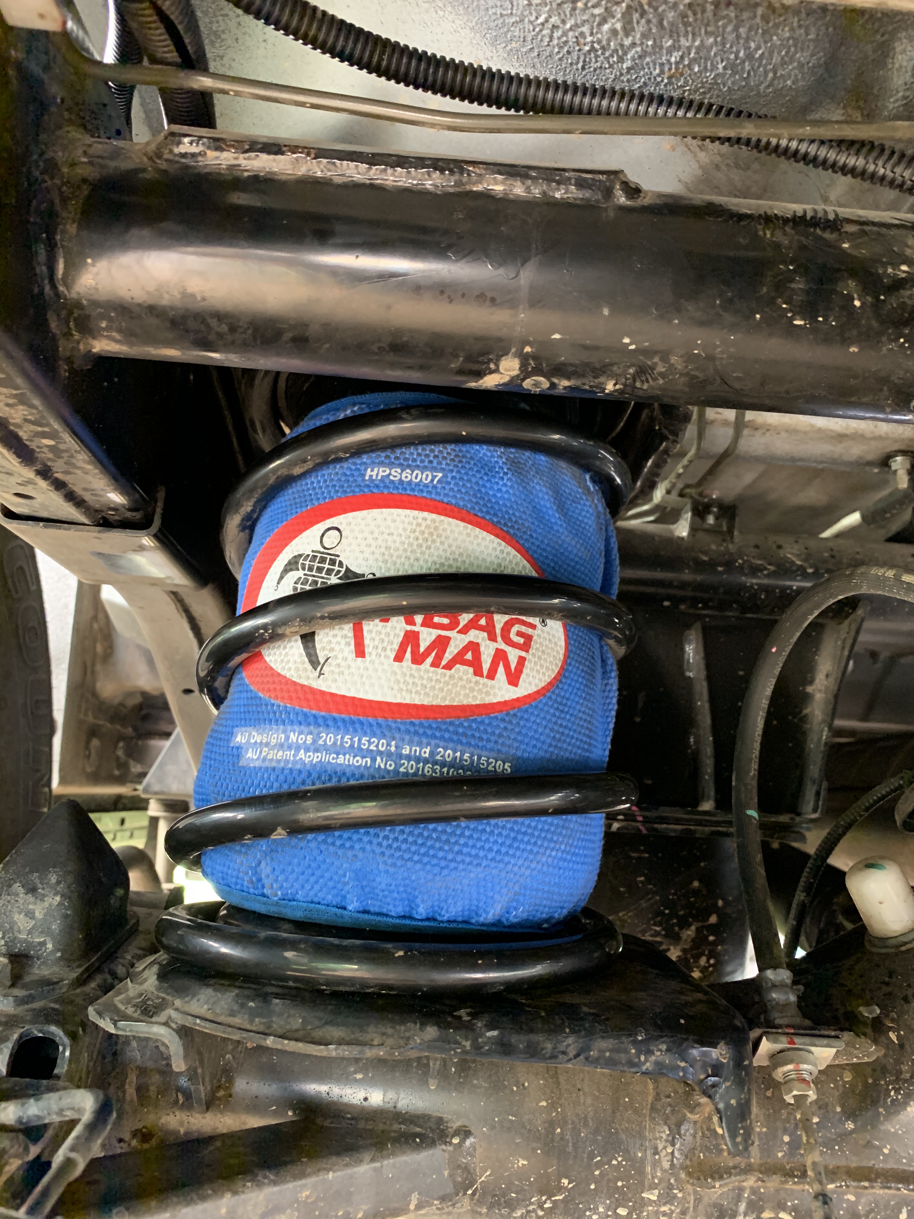 First thing I did was to install Airbag man HD airbags in the rear. I found the factory suspension too soft and uncomfortable when towing. Airbags fixed that. Since installing the bullbar and winch I have now upgraded the suspension as well.